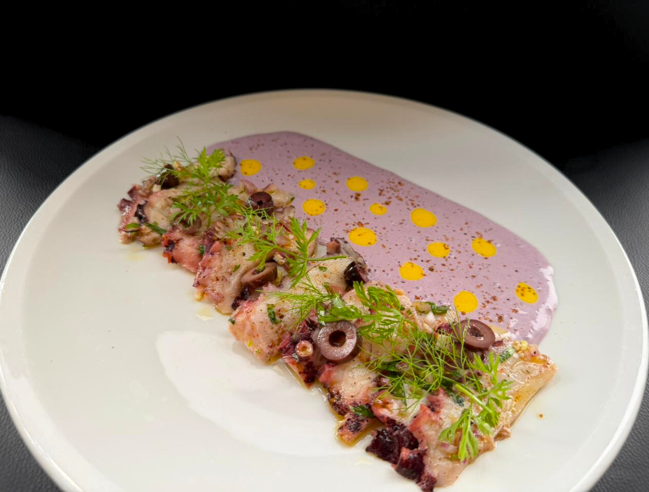 Slices of northern octopus with olive cream and touches of smoked chimichurri